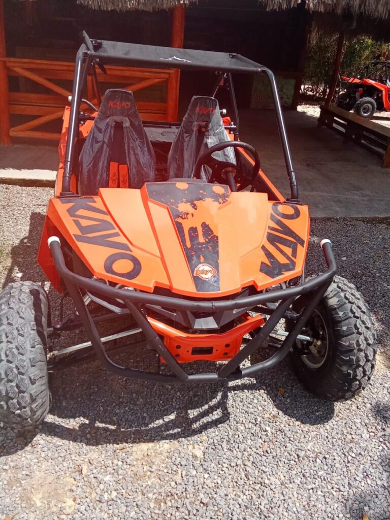 Nuestra nueva maquina Buggie Kayo es un modelo moderno, que alcanza una velocidad de 60km/h una mayor velocidad que el buggie común lo que permite mayor diversión. Sus asientos son acolchonados, tiene velocímetro, cinturón de seguridad, puertas de seguridad y espacio hasta 2 personas donde pueden ir adultos y niños desde los 4 años. El recorrido es privado pero siempre sosteniendo la diversion del barro para ensuciarse y los destinos, playa Macao, cenote Cueva Taina y degustaciones dominicanas.
