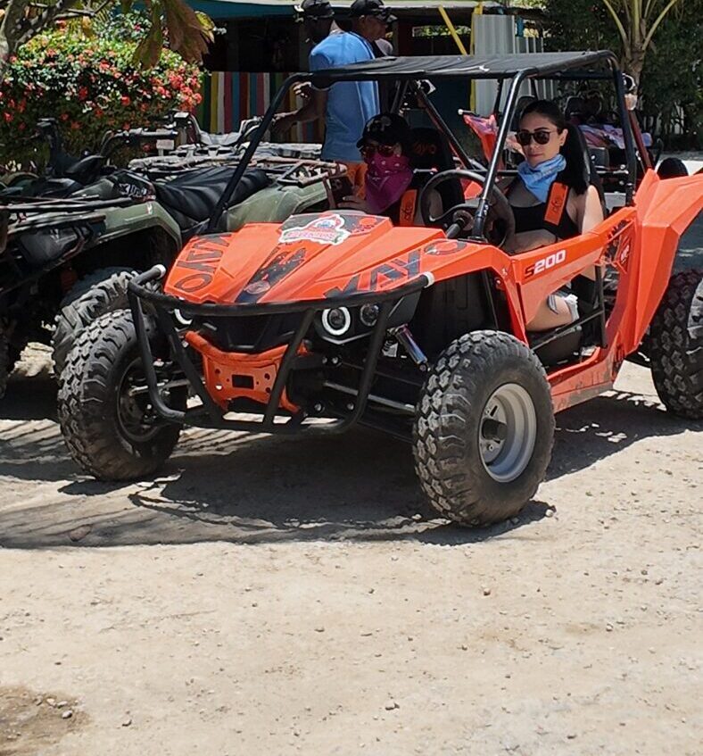 Nuestra nueva maquina Buggie Kayo es un modelo moderno, que alcanza una velocidad de 60km/h una mayor velocidad que el buggie común lo que permite mayor diversión. Sus asientos son acolchonados, tiene velocímetro, cinturón de seguridad, puertas de seguridad y espacio hasta 2 personas donde pueden ir adultos y niños desde los 4 años. El recorrido es privado pero siempre sosteniendo la diversion del barro para ensuciarse y los destinos, playa Macao, cenote Cueva Taina y degustaciones dominicanas.